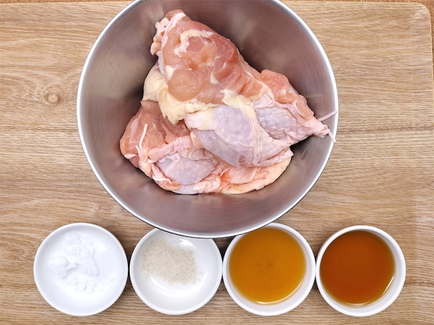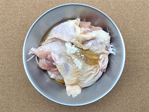 1. ボウルに鶏肉、塩、こしょう、紹興酒を入れてよく揉み、下味をつけます。