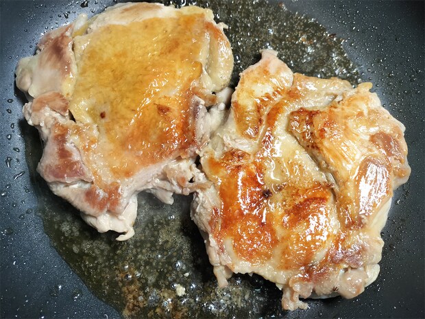 2. フライパンにゴマ油を引いて中火の弱にかけ、鶏肉の皮目を下にしてフライパンに乗せます。上にアルミホイルを敷いてフライパンなどの重しを乗せて、肉を平らにして7分焼きます。