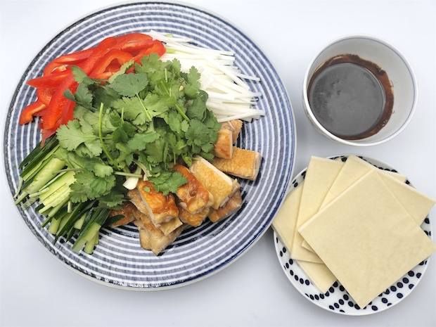 春巻きの皮にタレを塗って肉と野菜を巻きそのまま口に入れると、甜面醤と蜂蜜の甘さとコクの中にジューシーな鶏肉とパリパリの皮、そして個々の野菜の味がちゃんと感じられるのに妙に一体感のあるおいしさが待っていました。甜面醤自体が甘いみそですが、そこにさらに蜂蜜を加えてコクを増し、しょうゆの風味と五香粉の味と香りでおいしさが引き立ちます。北京ダックではなくペテンダックでも充分においしいです。本当の北京ダックではフライパンも油も使いませんが、家庭でパリパリの皮を実現するにはやはりこのレシピが簡単でおすすめです。