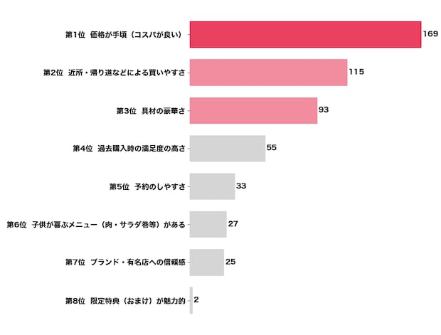 「選ぶ基準」の調査では、「価格が手頃(コスパが良い)」が第1位に。次いで「近所や帰り道などで買いやすいこと」が第2位にランクインしています。