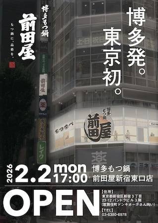 「博多もつ鍋前田屋」は、「もつ鍋に、品格を。」をコンセプトに、福岡の主要エリアである博多、天神、中洲を中心に現在6店舗を展開している。「博多で愛される本物の味を、全国の人に食べていただきたい」という一心で、これまで博多の地で磨き上げてきた味を携え、東京・新宿というエネルギッシュな立地への出店が決定した。