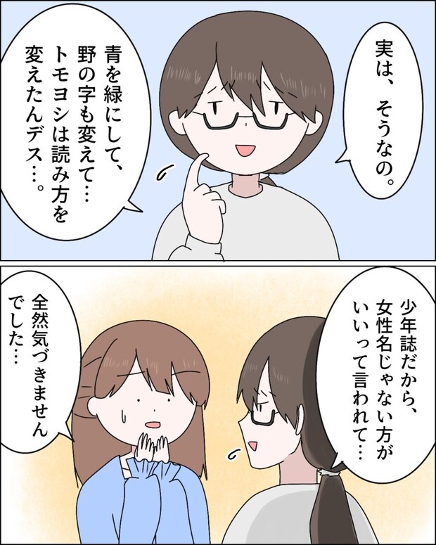 「実は、そうなの」と困惑気味に答えた知佳さんは、「青を緑にして、野の字も変えて・・トモヨシは読み方を変えたんデス・・。少年誌だから女性名じゃない方がいいって言われて・・」と緑乃トモヨシの名前の由来を説明してくれました。私は「全然気づきませんでした・・」と答えながら、推しから直々に名前の由来を教えてもらうという貴重な体験に喜びを噛みしめました。
