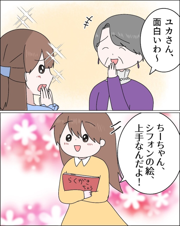 そんな私を見て「ユカさん、面白いわ~」と笑ってくれた義母。好きすぎて引かれるかなと心配していた私は、ポジティブに受け止めてくれる義母にも感動。すると、そこへマナが「ちーちゃん、シフォンの絵、上手なんだよ!」と嬉しそうに言いながら落書き帳を持ってきました。そういえば、マナはいつも知佳さんにお絵描きで遊んでもらっていたんだった!