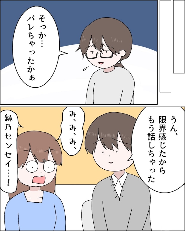 その後、2階からおりてきた知佳さんに康太が事情を説明。「そっか・・。バレちゃったかぁ」とちょっと困ったように言う知佳さんに「うん、限界感じたからもう話しちゃった」と申し訳なさそうに言う康太。その隣で私は、推しが目の前にいるという夢のような状況に「み、み、み、緑乃センセイ・・!」と緊張しながら話しかけました。