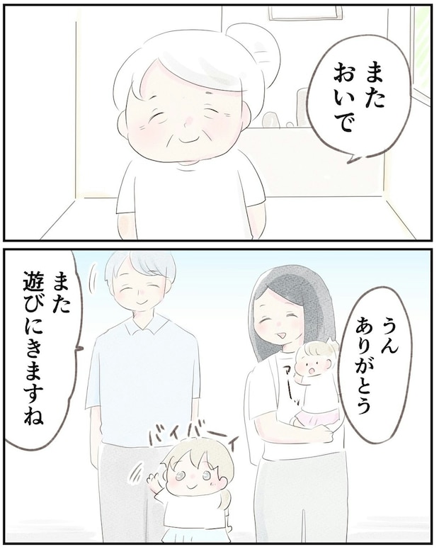祖母の家で楽しい時間を過ごしたゆうさん一家。「また遊びに来る」と夫も笑顔であいさつをしました。