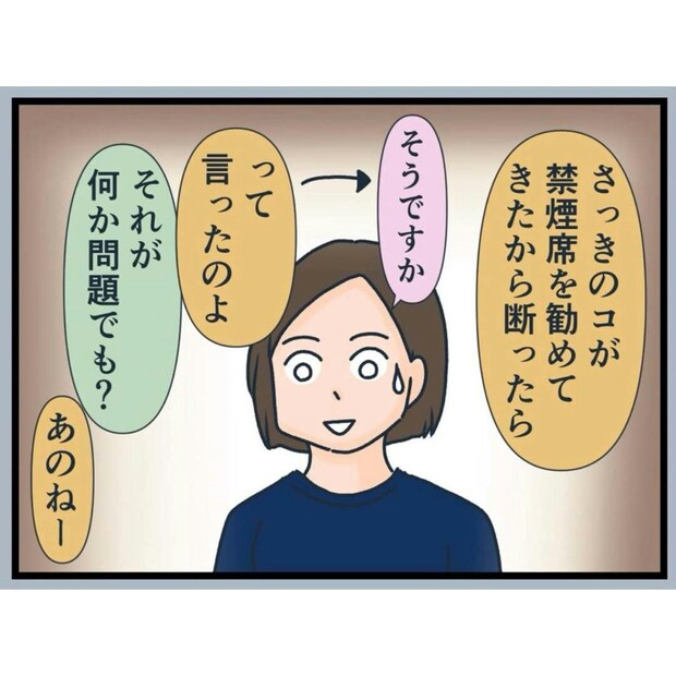 すると、タバコを吸わない人が喫煙席に座ってはいけないのかと問句さん。タバコの煙など不快にならないと言います。そして、禁煙席を勧めて来たバイトさんの教育がなってないと言い出しました。