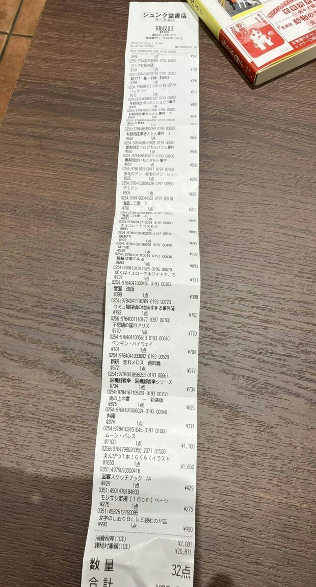 ズラーッと長いレシート。これは一体何を買ったのかと思いきや、すべて本。読書好きな娘さんなのですね。