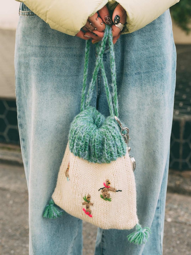 刺しゅうモチーフとタッセルが可愛い巾着バッグ。ニットならではのあたたかみを感じる、冬ならではのアイテム。