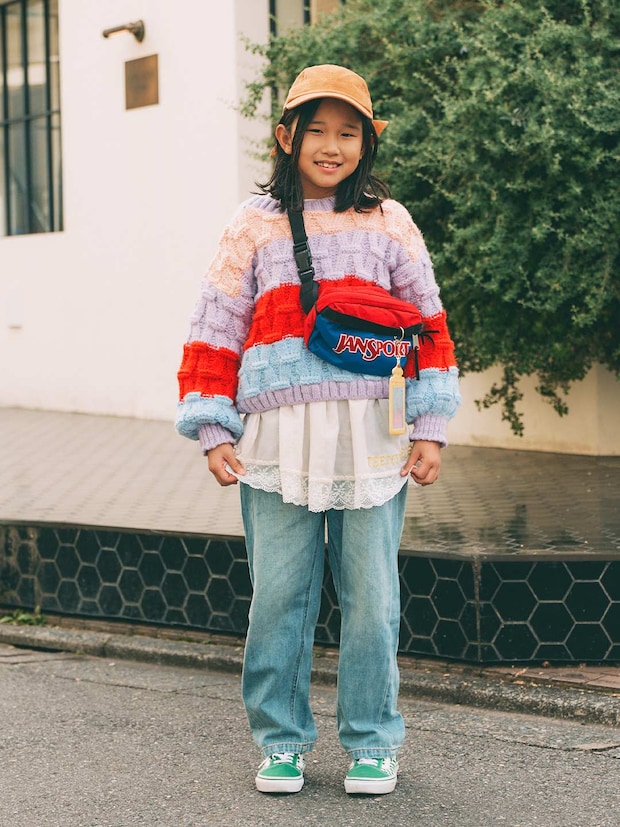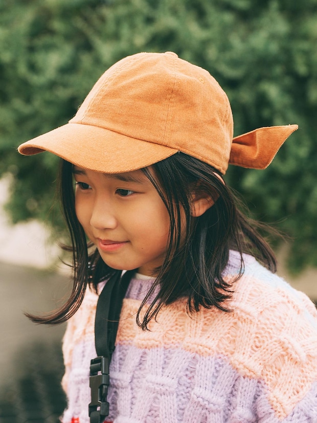 オレンジのキャップをかぶって、元気をチャージ♪ ガーリーなビッグリボンのディテールで、キッズのテンションもアップ!