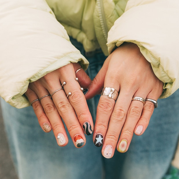 シルバーリングを散りばめて、カジュアルコーデに華やぎをプラス!一本一本異なるアートが施されたネイルは、こだわりの仕上がり。