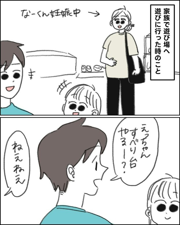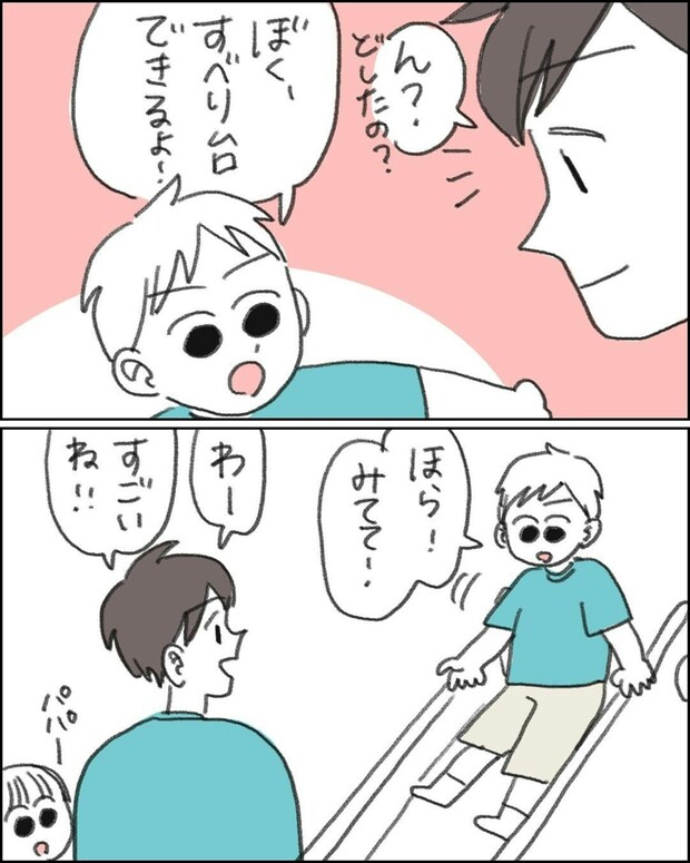男の子は、なこさんの夫にすべり台を滑って見せると、まるで、娘のえっちゃんに張り合うように自分をアピールし始めました。