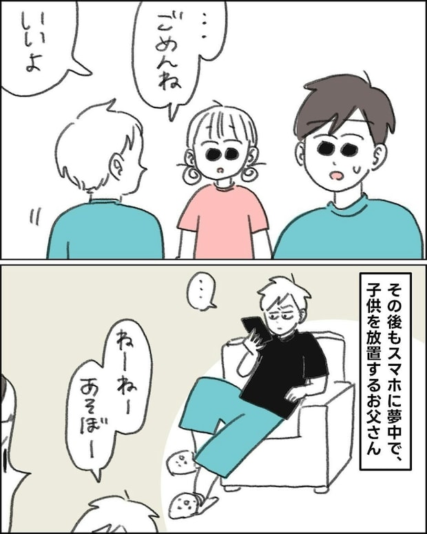 なこさん一家が、家族で遊び場を訪れたときのできごとです。夫が娘のえっちゃんと遊び始めると、後ろから見知らぬ子どもの声が…。