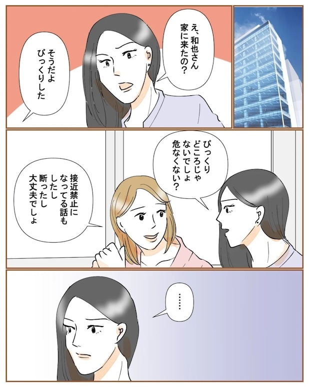 翌日、いつも通り出社した私は、麗子に昨日の出来事を話しました。「もうびっくりしたよ」私がそう言うと、麗子は「びっくりどころじゃないでしょ、危なくない?」と真剣な表情。私は麗子を心配させまいと「接触禁止になってる話もしたし、断ったし大丈夫でしょ」となんてことないように言いました。しかし、麗子の表情は曇ったままです。