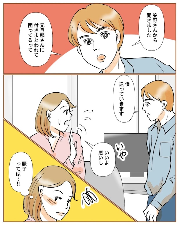 「笠野さんから聞きました、元旦那さんに付きまとわれて困ってるって・・・僕送っていきます」佐藤さんからの突然の申し出に、思わず言葉を失いました。笠野さんって、完全に麗子の仕業だな。私は慌てて「いや、いいよ悪いし」と断ります。