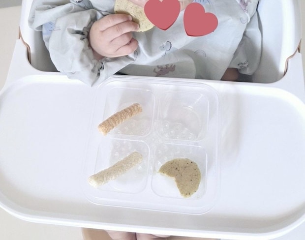 あこ☺️🐝Ⓜ🦕(@spraymum111)さんが投稿していたのは、手づかみ食べの時期に真似したい便利なアイテムとその使い方。100円ショップで買えるコスパ最高なグッズとは?