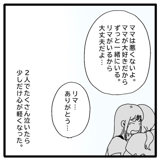 「ママは悪くないよ、ママが大好きだからずっと一緒にいる、リマがいるから大丈夫だよ・・・」この子はいつからこんなに強くなったんでしょうか。私はリマと抱き合いながら、わんわんと涙を流しました。2人でたくさん泣いたら、少しだけ心が軽くなりました。