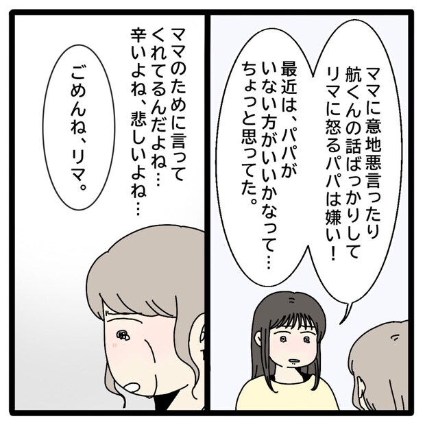 リマは私の話を聞き終えると「ママに意地悪言ったり、航くんの話ばっかりしてリマに怒るパパは嫌い!最近はパパがいない方がいいかなってちょっと思ってた」と今まで思っていたことを話してくれました。きっと、本当は辛いし悲しいのに、私のために言ってくれているんでしょう。私は涙を流しながら、リマに謝りました。
