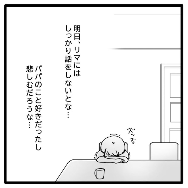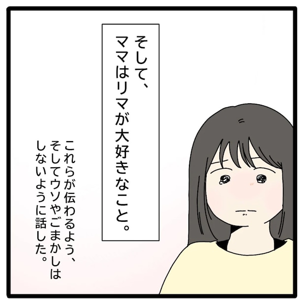 そして翌日。私はリマの目をまっすぐ見つめて、「パパにママより大切な人ができたこと」、「パパとママは離婚すること」、「リマはママと一緒でいいか」、「パパもママもリマの親であることは変わりないこと」を分かりやすく伝えました。