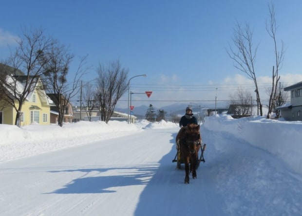 初挑戦は1月14日の午前中に決行。吹雪が続いたが晴れて、道路の除雪も行われた。前日にはハナと調馬索運動で調教済み。好条件がそろったため、馬そりに乗っての買い物へと出かけた。