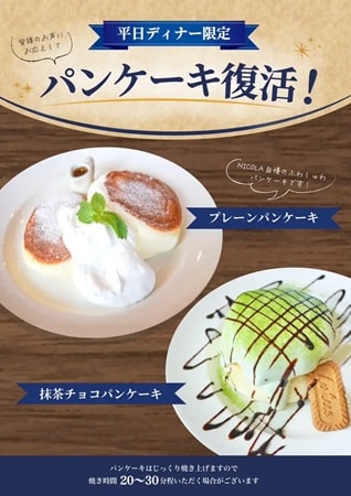 兵庫県神戸市灘区にある、ナポリピザと生パスタのイタリアン「Pizzeria NICOLA六甲店」は、1月28日(水)より、ふわしゅわ食感のスフレパンケーキを平日ディナー限定で復活提供している。また、新お手軽ディナーコースを同時スタートさせた。