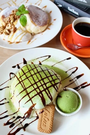 「プレーンスフレパンケーキ」と「抹茶チョコスフレパンケーキ」を用意しており、「プレーンスフレパンケーキ」は、粉糖と生クリームで仕上げた、素材の味を楽しむ定番の一皿。「抹茶チョコスフレパンケーキ」は、抹茶のほろ苦さとチョコレートソースの甘さを合わせた、満足感のあるデザートとなっている。