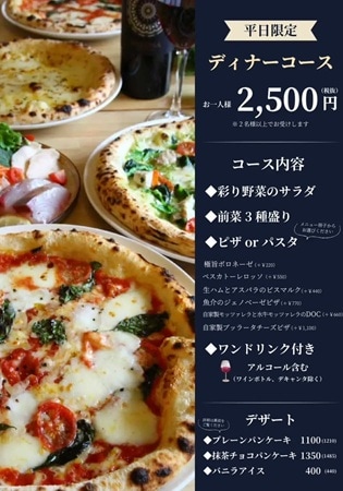 前菜・サラダ・ピッツァorパスタをバランスよく組み合わせた、ワンドリンク付きの平日限定ディナーコースとなっている。