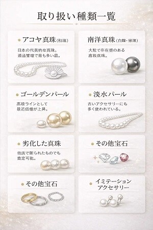 同店が取り扱うのは、アコヤ真珠(和珠)・ 南洋真珠(白蝶/黒蝶)・タヒチアンパール・ゴールデンパール・淡水パール・バロックパール・劣化した真珠(黄ばみ/くすみ/剥がれ)・鑑別書なしの真珠などだ。