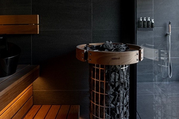 隣接するサウナは、落ち着いたBLACK基調でリラックスできる空間に。ストーブはHARVIAの「CILINDRO」を採用している。