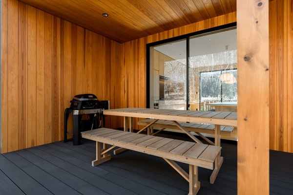富士北麓の湧水を利用した露天風呂と内風呂は、好みで水風呂とお湯風呂が自由に利用可能。寒い日には露天風呂にお湯を張り、内風呂を水風呂に。夏の暑い日には露天風呂を水風呂にして避暑を楽しむことも。直結するバルコニーで自然と一体化する外気浴もできる。