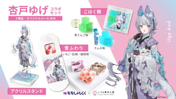 「杏戸ゆげ コラボセット」は、「琥珀糖」空:ラムネ味/翠:青りんご味、「雪ふわり」いちご・巨峰・珈琲味、限定描き下ろし杏戸ゆげ「アクリルスタンド」のセット。