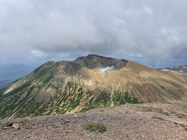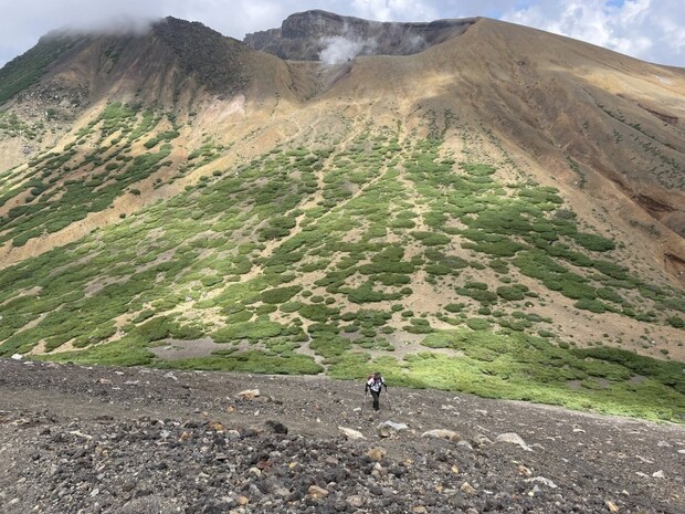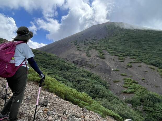ジグザグの登山道を登っていくと、後ろには雌阿寒岳の迫力ある姿を見ることができます。