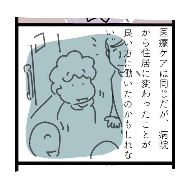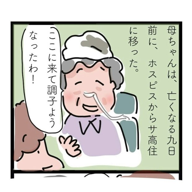 おかんさんの母親は、亡くなる9日前にホスピスからサービス付き高齢者向け住宅に移りました。住まいが変わったことで、母親の病状は安定し、前向きな言葉を口にするようになりました。この変化に、おかんさんもとても喜びを感じていました。