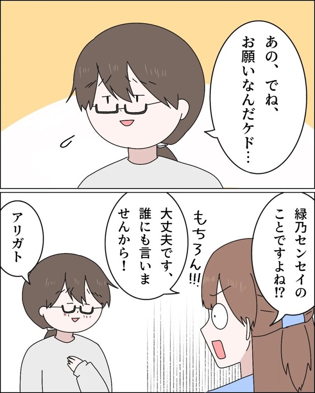 「あの、でね、お願いなんだケド・・」知佳さんにそう言われて、「緑乃センセイのことですよね!?もちろん!!大丈夫です、誰にも言いませんから!」当然とばかりにそう答えると、「アリガト」知佳さんはホッとしたように言いました。