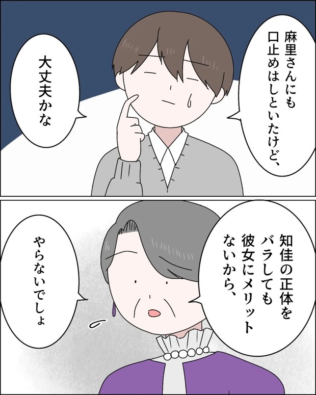 すると康太が、「麻里さんにも口止めはしといただけど、大丈夫かな」と不安そうにポツリ。「知佳の正体をバラしても彼女にメリットないから、やらないでしょ」と言う義母。
