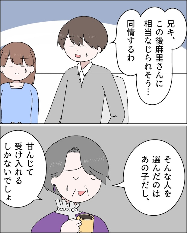 「兄キ、この後麻里さんに相当なじられそう・・同情するわ」と呟く康太の声を聞きながら、納得する私。「そんな人を選んだのはあの子だし、甘んじて受け入れるしかないでしょ」と義母はコーヒーを飲みながら呆れていました。