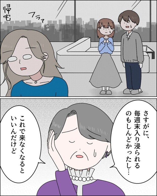 「このマンションは手に入らない」ということが身に染みてわかったのか、呆然として家をマンションから出て行ったまりさんのことを思い出し、「さすがに、毎週末入り浸られるのもしんどかったし・・これで来なくなるといいんだけど」と義母がしんどそうに言いました。