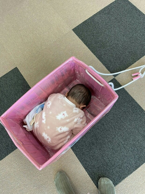 娘さんにとっては初めての児童館。ひもで引っ張る箱型のおもちゃで楽しく遊んでいたそうですが、途中で娘さんが爆睡。写真を見ると、箱にすっぽりおさまった赤ちゃんが。振動と箱のサイズ感がとても心地良かったのでしょうね。