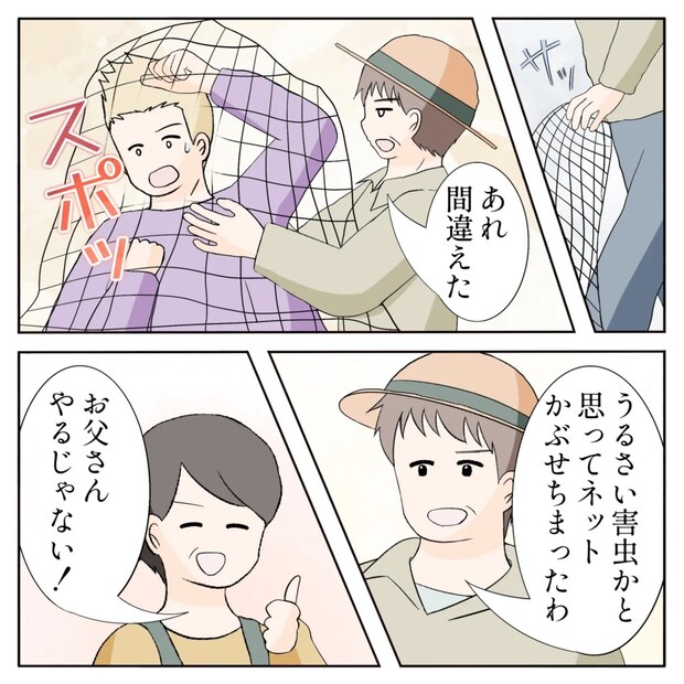 殴られると思い身構えていると、いつの間にか畑から帰って来ていた父さんが元夫にスポッと害虫ネットを被せ、元夫は驚いて固まりました。「うるさい害虫かと思ってネット被せちまったわ」と言う父さんに「お父さんやるじゃない!」と笑う母さん。