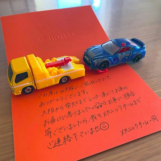 宿泊先のホテルで息子さんが落としてしまったという、パトカーのミニカー。後日、ホテルからそのミニカーが送られてきたそうなのですが、なんとレッカー車に乗せられてきたそう。しかも、同封されていた手紙には「メカニックチーム一同」という名前が添えられていたのです。