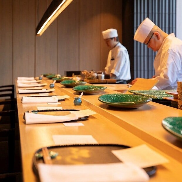 今回は、大きな窓から四季折々の庭園を望む鮨カウンターをリザーブ。職人の所作を間近に感じられる、まさに特等席!
