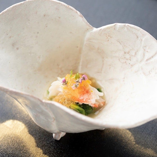 まさにいまが旬の鳥取県産の松葉ガニの身肉に、京壬生菜のお浸しを添え、柚子が香るジュレを合わせた、冬らしい一皿。