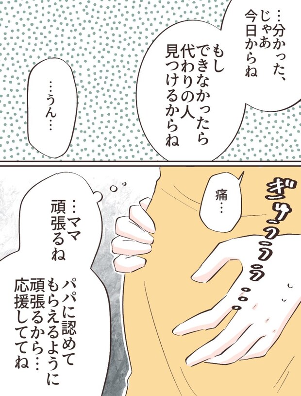 「・・分かった。じゃあ明日kららね。もしできなかったら代わりの人見つけるからね」リヒトさんに念押され、「・・うん・・」と頷いた後、「痛・・」とお腹をさすりながら、「・・ママ頑張るね。パパに認めてもらえるように頑張るから・・応援しててね」と優しく声をかけました。