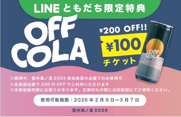 LINE友だち登録すると、「LINEともだち特典」として先着1800名に、イベント参加施設で使えるクラフトコーラ「OFF COLA」200円割引クーポンをゲットできる。