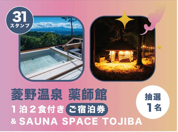 さらに、全31スタンプを獲得すると「多分いないけど31スタンプコンプリート賞」として、「菱野温泉 薬師館」1泊2食付きご宿泊券(2名1組)&「SAUNA SPACE TOJIBA」(120分・2名利用)が抽選で1名にプレゼントされる。