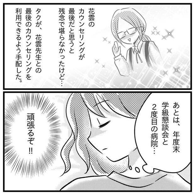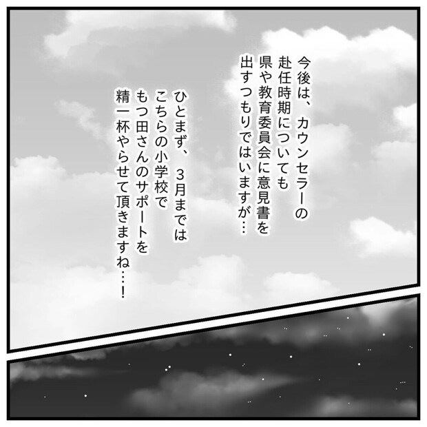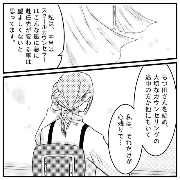担任やスクールカウンセラーなど周りの力を借りながら、ありのままの我が子と向き合う母の葛藤を描きます。もっつんさんを支援の道へと導いてくれたスクールカウンセラーが異動することになってしまい...。