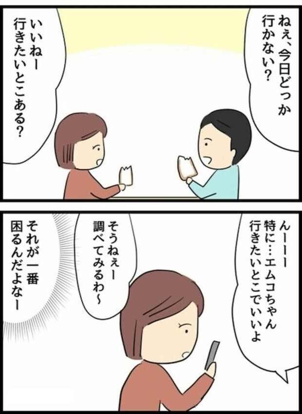 話し合いながら決めたいエムコちゃんと、どうせエムコちゃんの行きたいところになるんだからと最初からお任せモードのエスオ君。