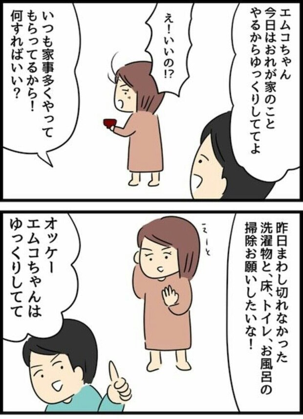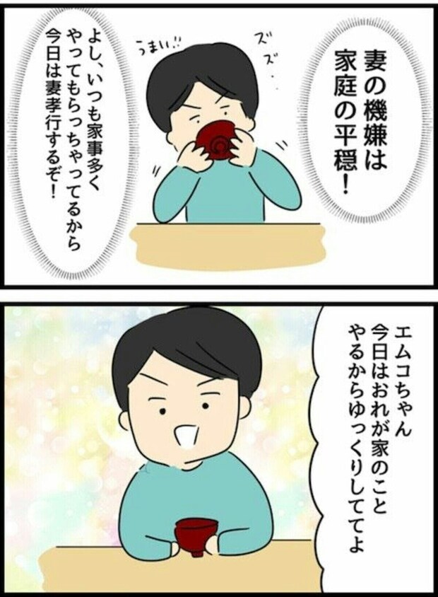 お酒を飲みすぎてしまったことを反省し、エムコちゃんにもゆっくりしてもらおうと家事を頑張るエスオ君ですが、その方法でも空気が張り詰めてしまうことに。