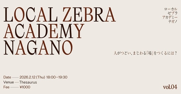 もりと/鎮守の杜プロジェクト実行委員会は、2月12日(木)に、「LOCAL ZEBRA ACADEMY NAGANO vol.4 人がつどい、まじわる『場』をつくるには?」を、長野市のThesaurusにて開催する。