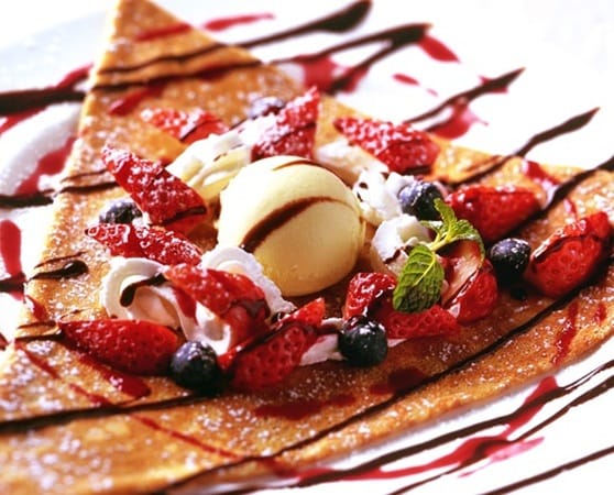 「苺のクレープ」880円(税込)は、香ばしいライ麦入りの自家製クレープにフレッシュな苺をトッピング。さらにバニラアイスとホイップクリームを添えて豊かな味わいに。ストロベリー&チョコレート、2種類のソースがより美味しさを引き立てる。