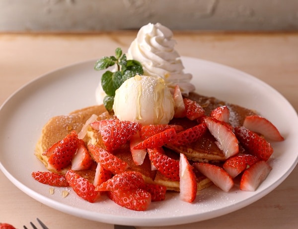 渋谷店限定で通年販売される「苺のパンケーキ」980円(税込)も、旬の苺を使って提供される。焼き立てふわふわのパンケーキにフレッシュな苺、たっぷりのホイップクリーム、バニラアイスを添えた絶妙なハーモニーはクセになる美味しさだ。好みでメープルシロップをかけて、味の変化も楽しめる。